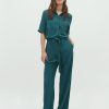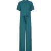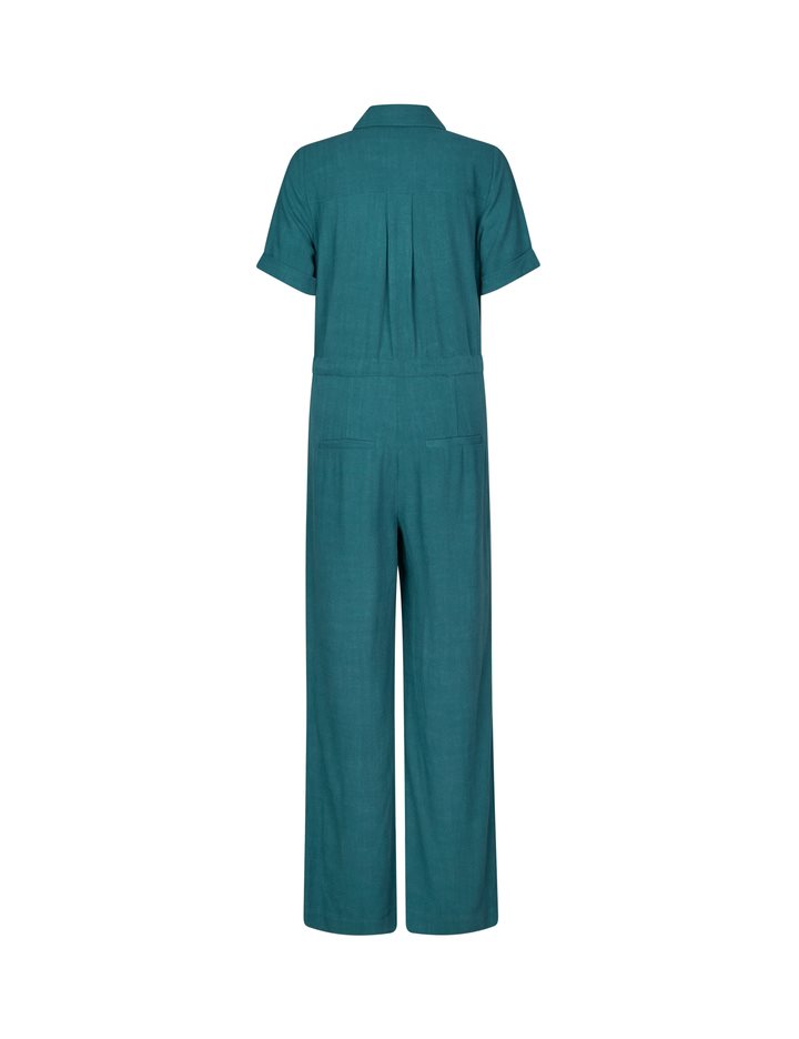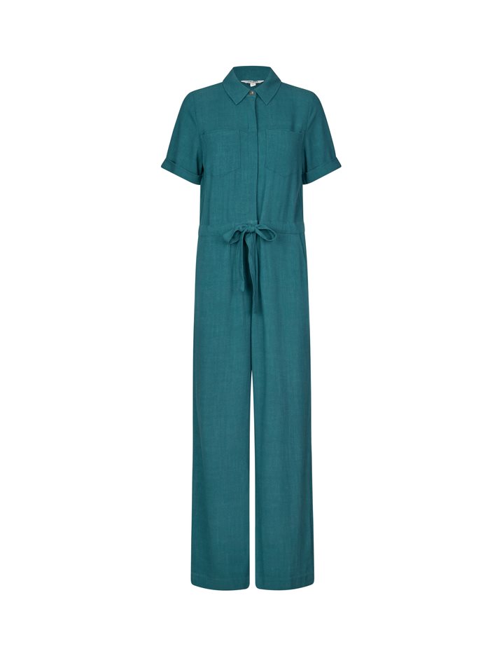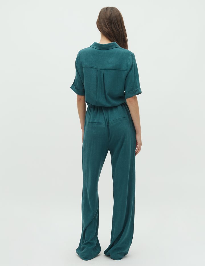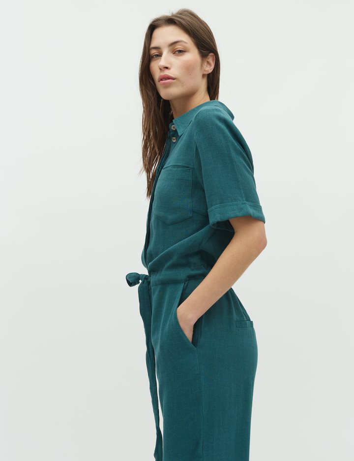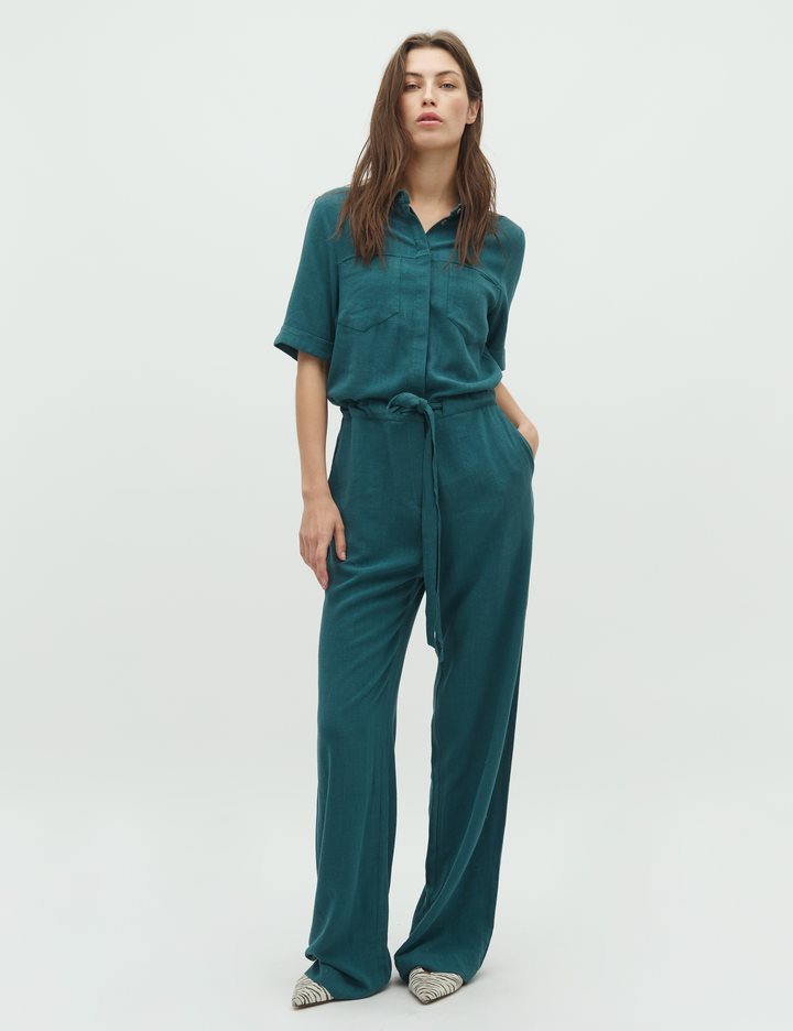 Short-sleeved jumpsuit with drawstring waist.- Material: 80% Viscose, 20% Linen- Short sleeves- Adjustable waist- Button closure- Shirt collar- Wide legs- Regular fitThe model's height is 176 cm and she is wearing size S.