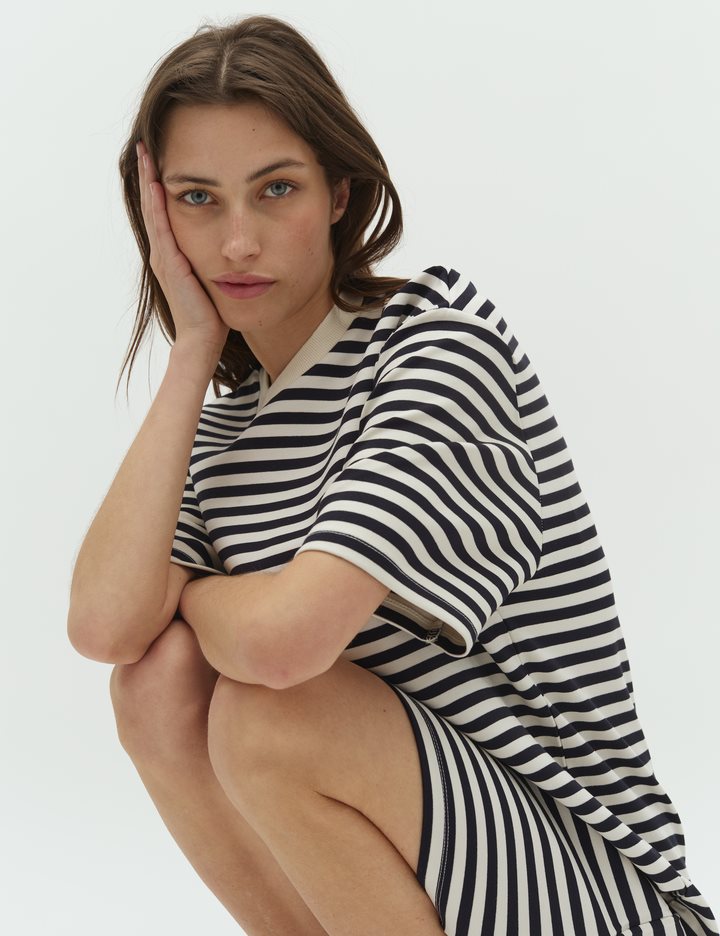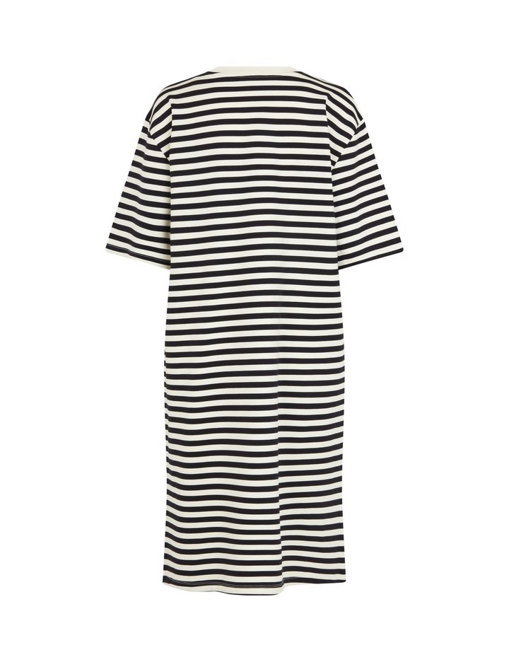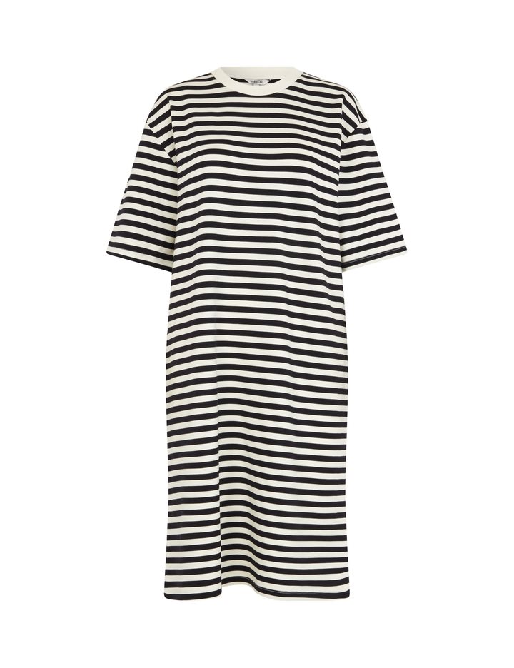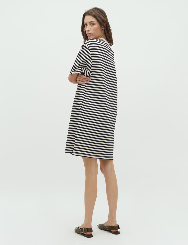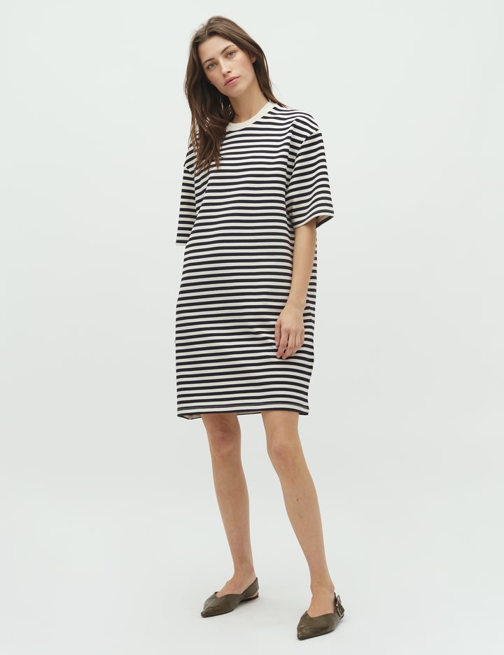 Loose dress with short sleeves.- Material: 74% Viscose, 23% Polyamide, 3% Elastane- Short sleeves- Round neck- Loose fit- Short lengthThe model's height is 176cm and she is wearing a size S.
