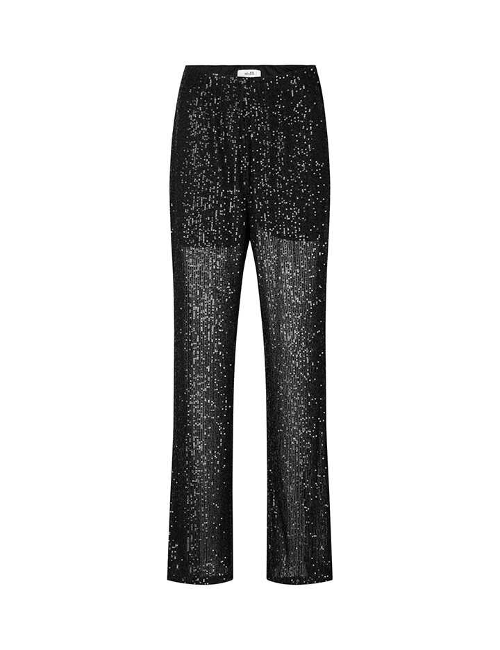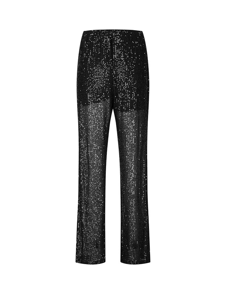 Jersey mesh pant with sequins all-over.- Material: 95% Polyester, 5% Elastane- Straight legs- Loose fit- Sequins all-over- See-through, however with "inner shorts".Color: Black