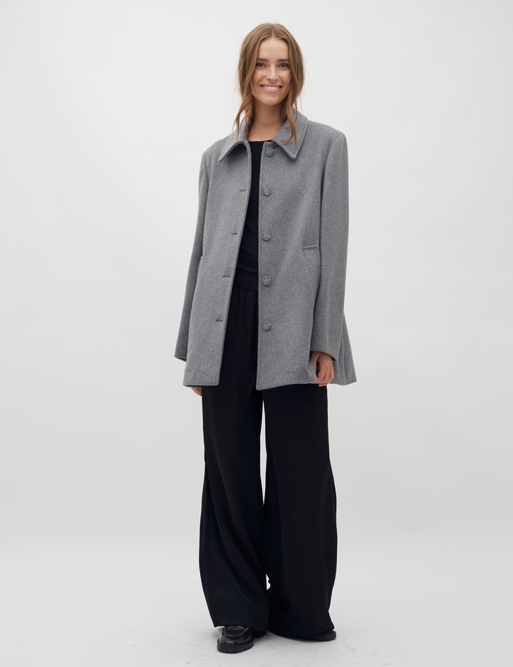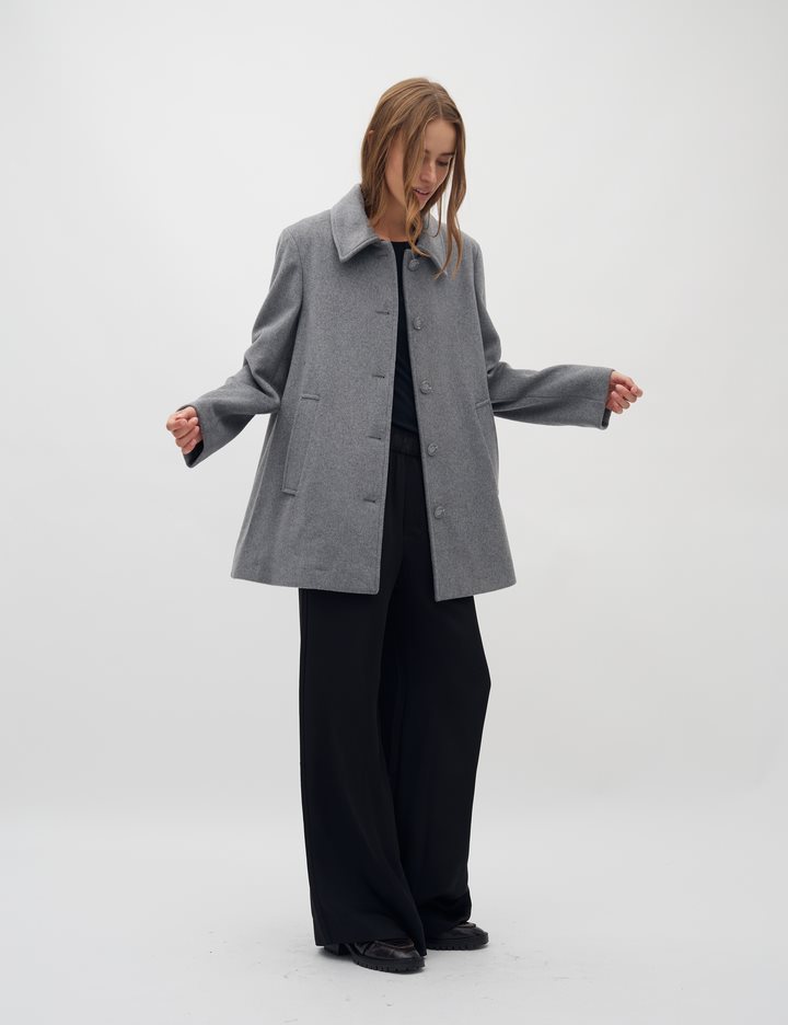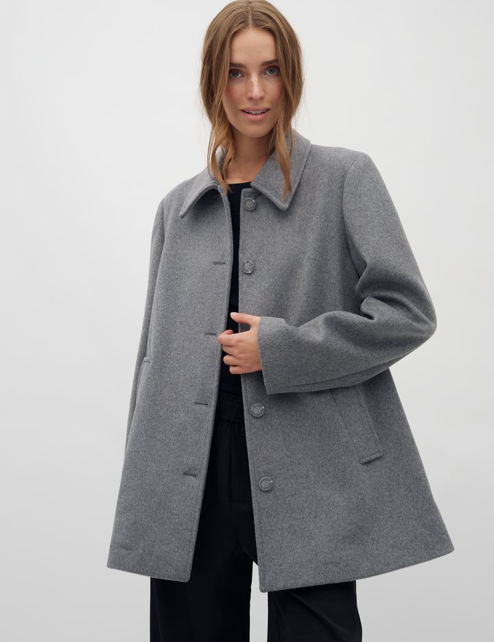 Short coat with buttons.- Material: Shell; 50% Wool, 45% Polyester, 5% Other fibres. Lining; 100% Polyester- Short length- Relaxed fit- Shirt collar- Button closure- Color: Light Grey melange