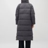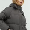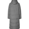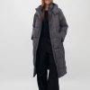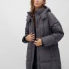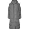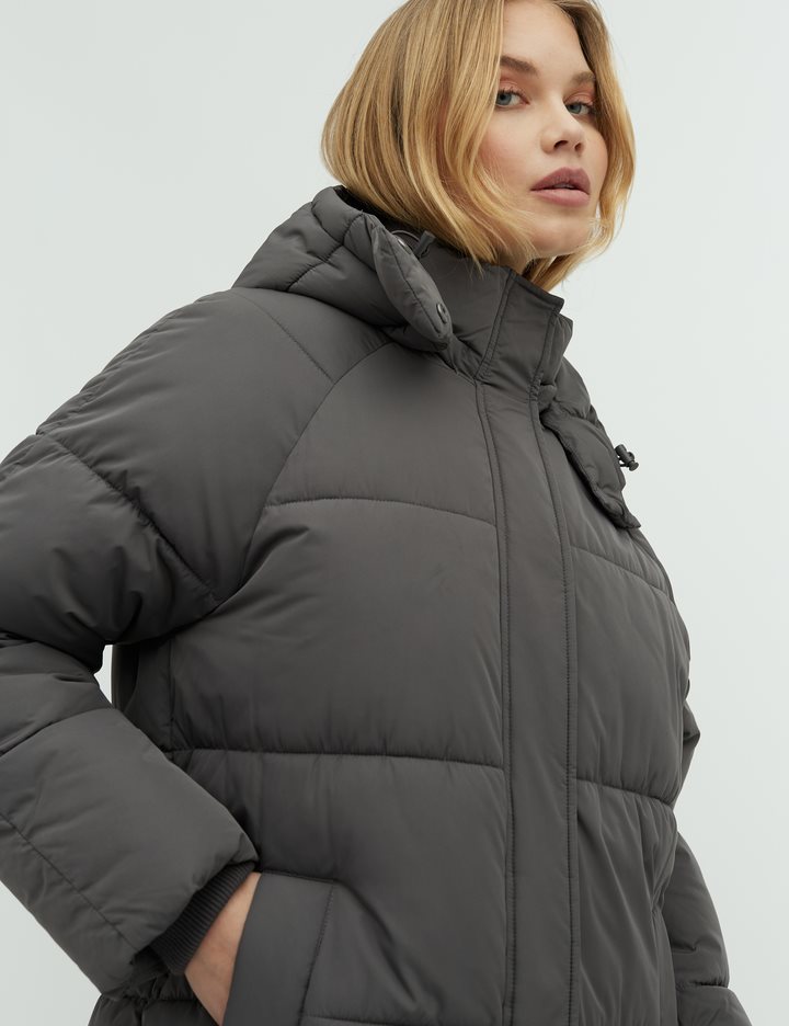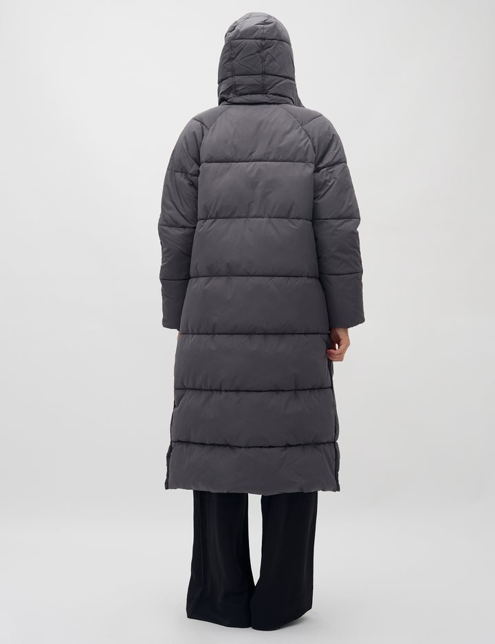 Long puffer jacket with hoodie.- Material:Shell: 100% Recycled Polyester, Lining: 100% Polyester- Long sleeves with concealed elastication at the cuffs- Zip and button closure- Front pockets- Long winter jacket- Hoodie- Stand-up collar- Side slits with button closure- Colour: MagnetThe height of the dark haired model is 172 cm and she is wearing a size s/m- Chest width: 60 cm in size s/m- Length: 120 cm in size s/m