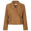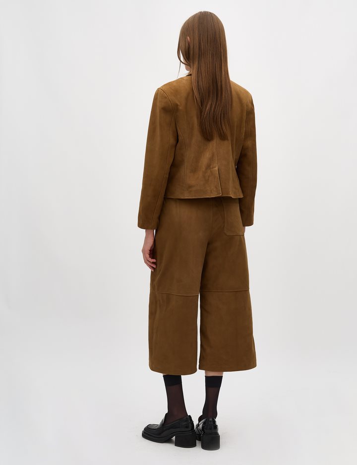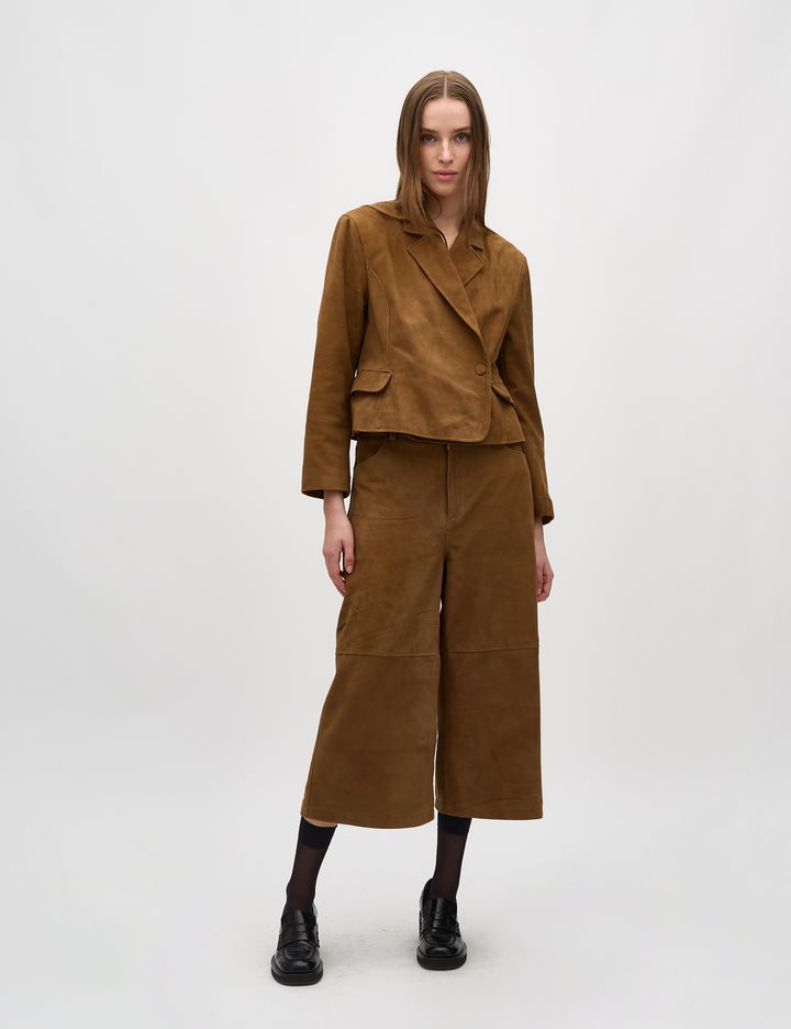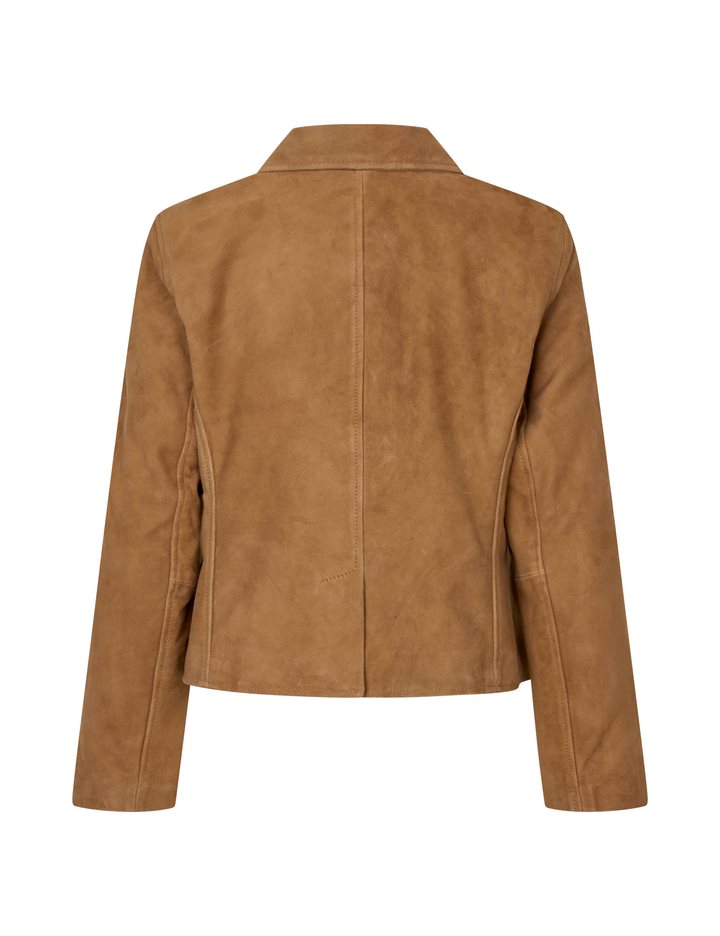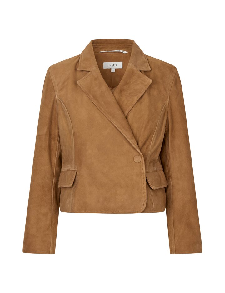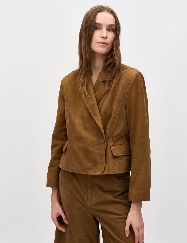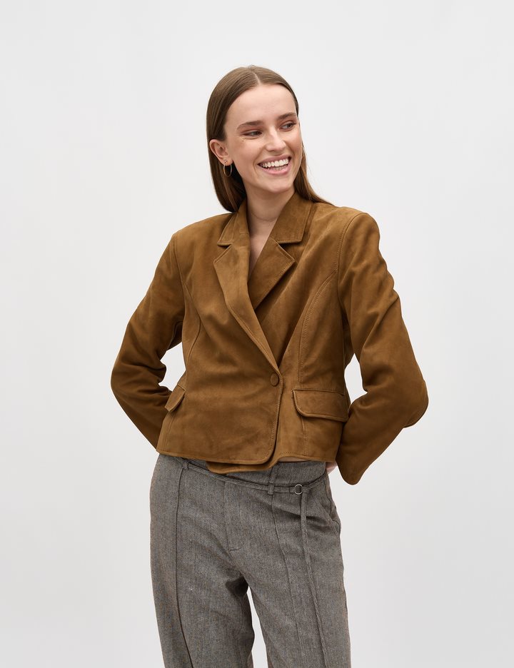 Short blazer in suede- Material: 100% Goat Suede- Closes on the side with a button- Two pockets on the front- Long sleeves- Goat suede- Colour: Cognac BrownThe model is 176 cm tall and wears size S