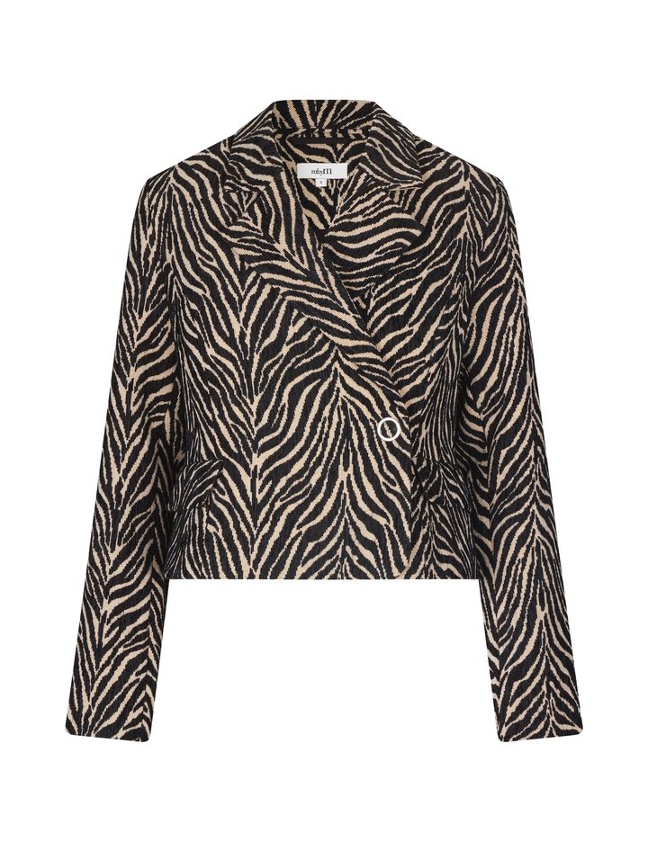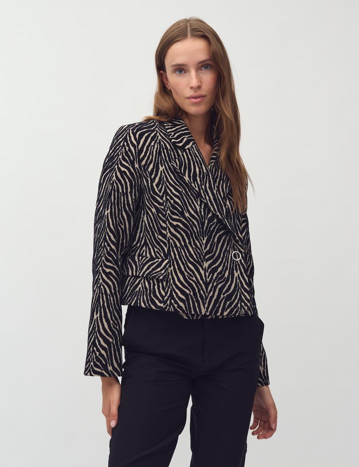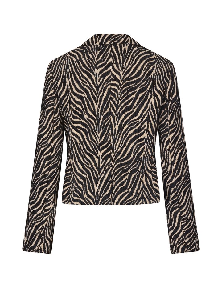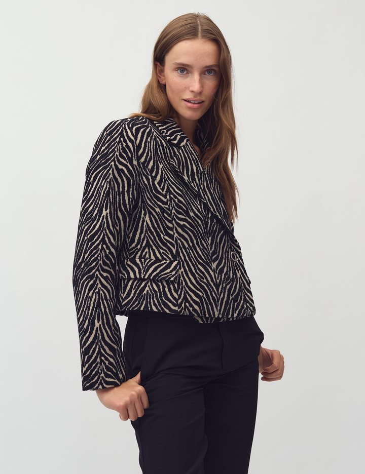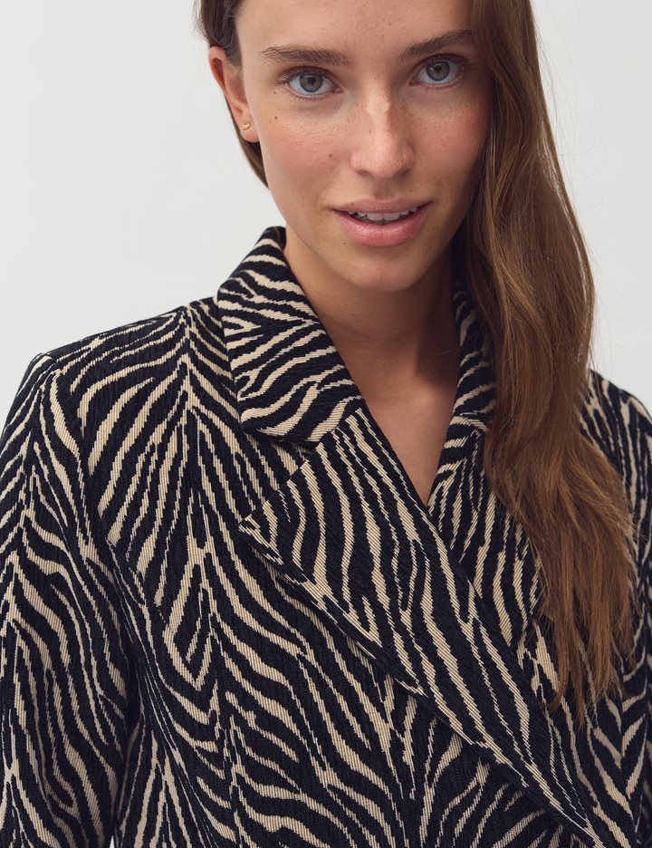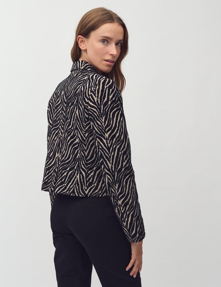 Short blazer jacket in zebra print.- Material: 100% Polyester- Long sleeves- Closes at the side with button- Two front pockets- Lapel collarThe height of the model is 176 cm and she is wearing a size S.