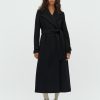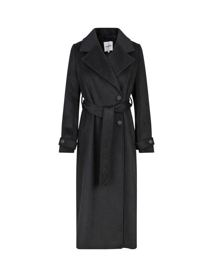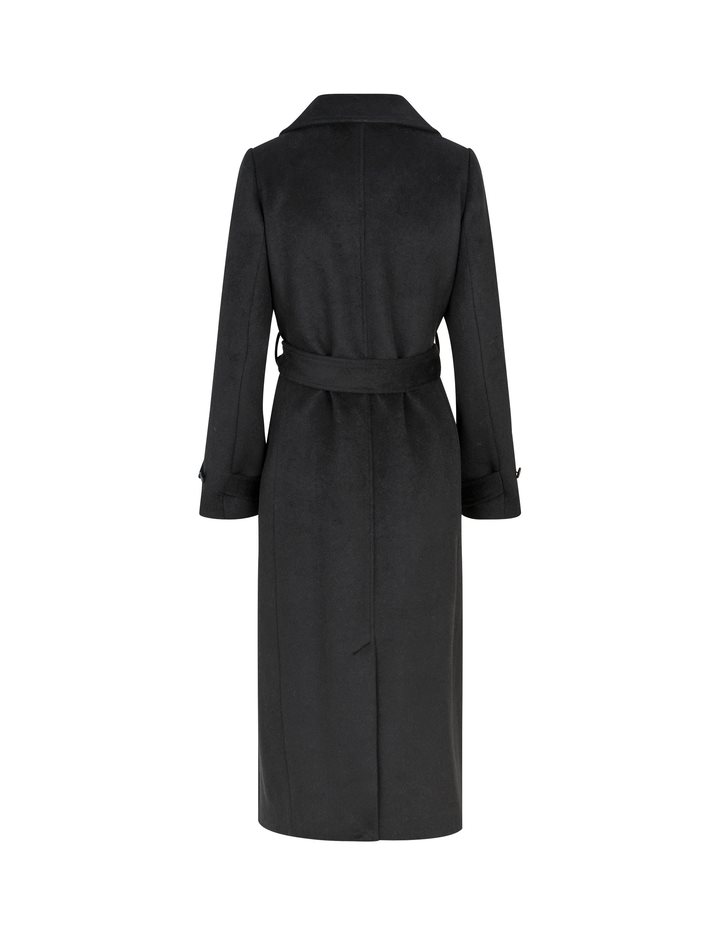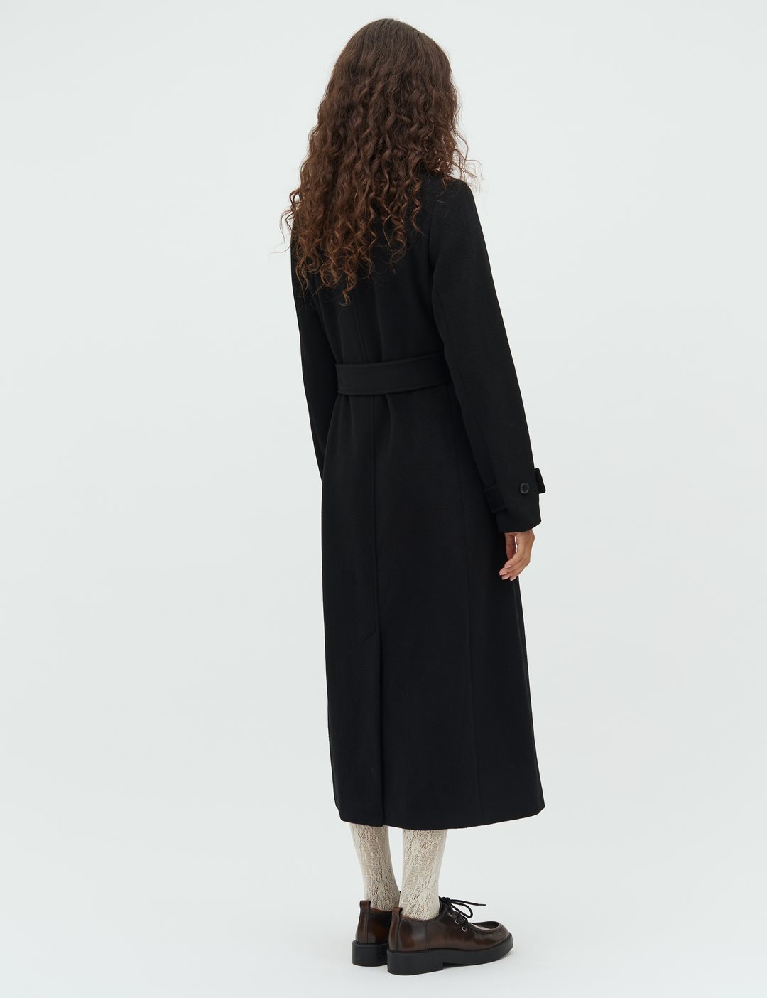 Long coat with tie waist.- Materials: 50% Wool, 45% Polyester, 5% other fibers- Maxi length- Side pockets- Button closure