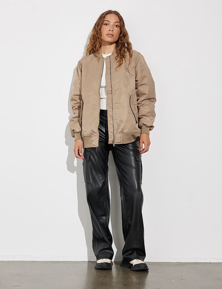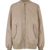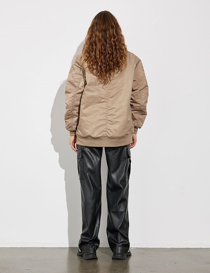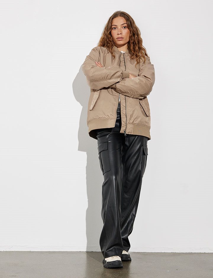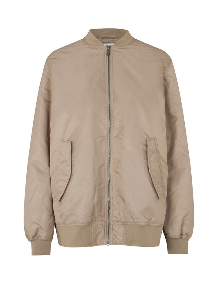 Oversized bomber jacket with frontzip.- Material: Shell; 100% Nylon. Lining; 100% Polyester. Filling; 100% Polyester- Long sleeves with ribbed hems- Side pockets- Front zipper- Ribbed trimsThe height of the model is 173 cm and she is wearing a size S.