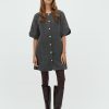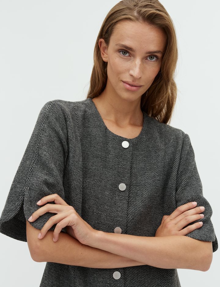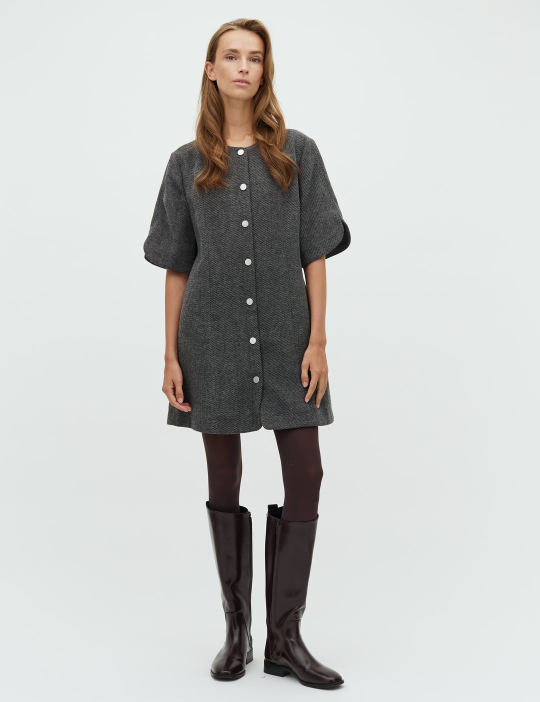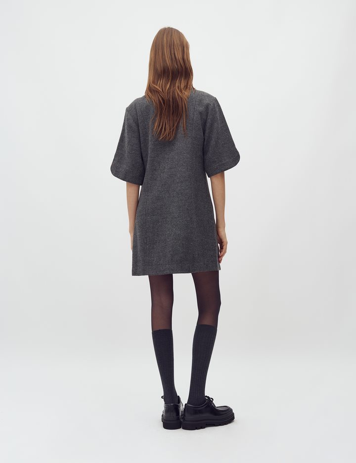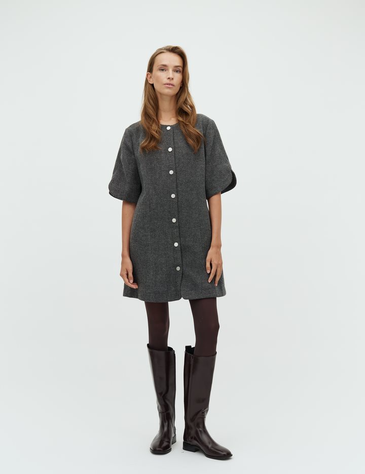Herringbone mini dress with buttons.- Material: 92% Polyester, 5% Wool, 3% Elastane- Mini length- Loose fit- Short loose sleeves- Button closure- Thick fabricThe model's height is 176 cm and she is wearing a size S.