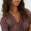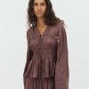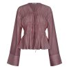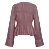 Smocked blouse- Material: 83% Viscose, 17% Nylon- Smocked front- Drawstring closure- V-neck- Long wide sleeves