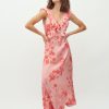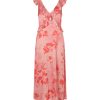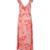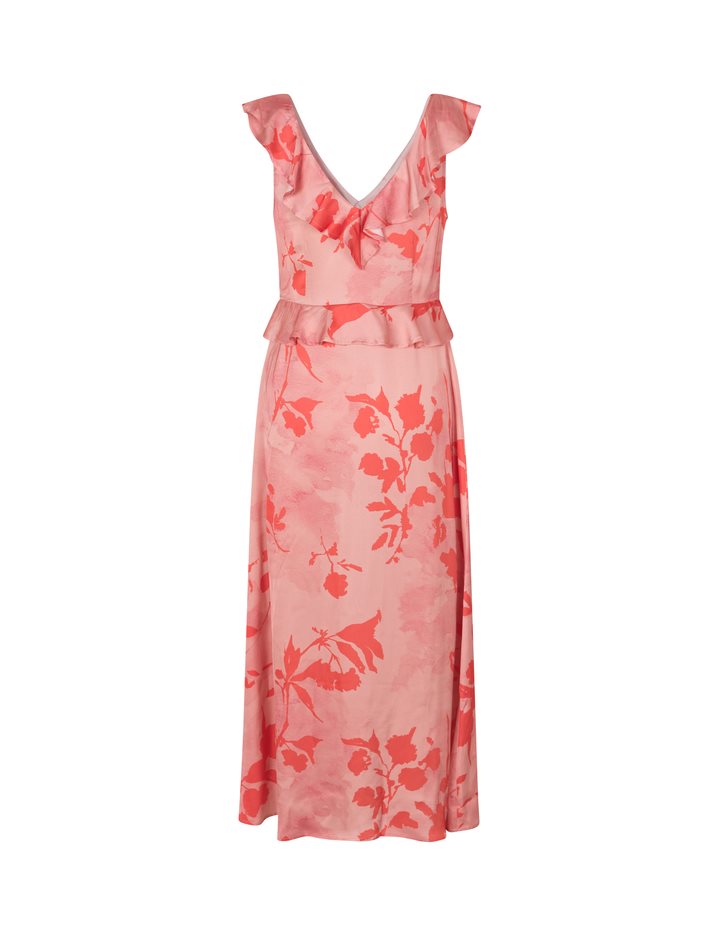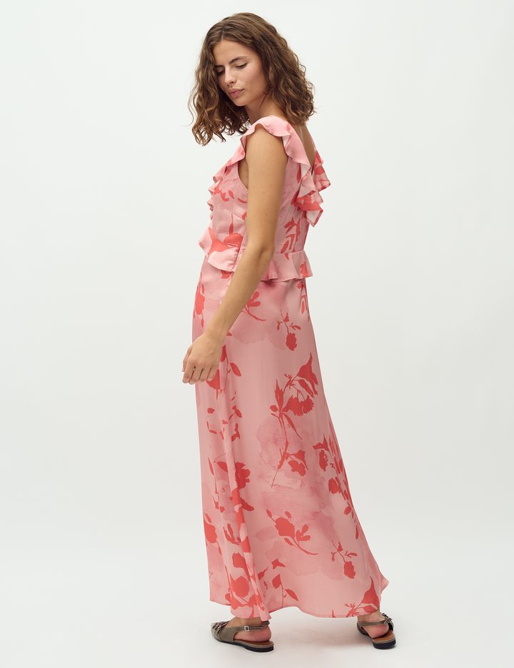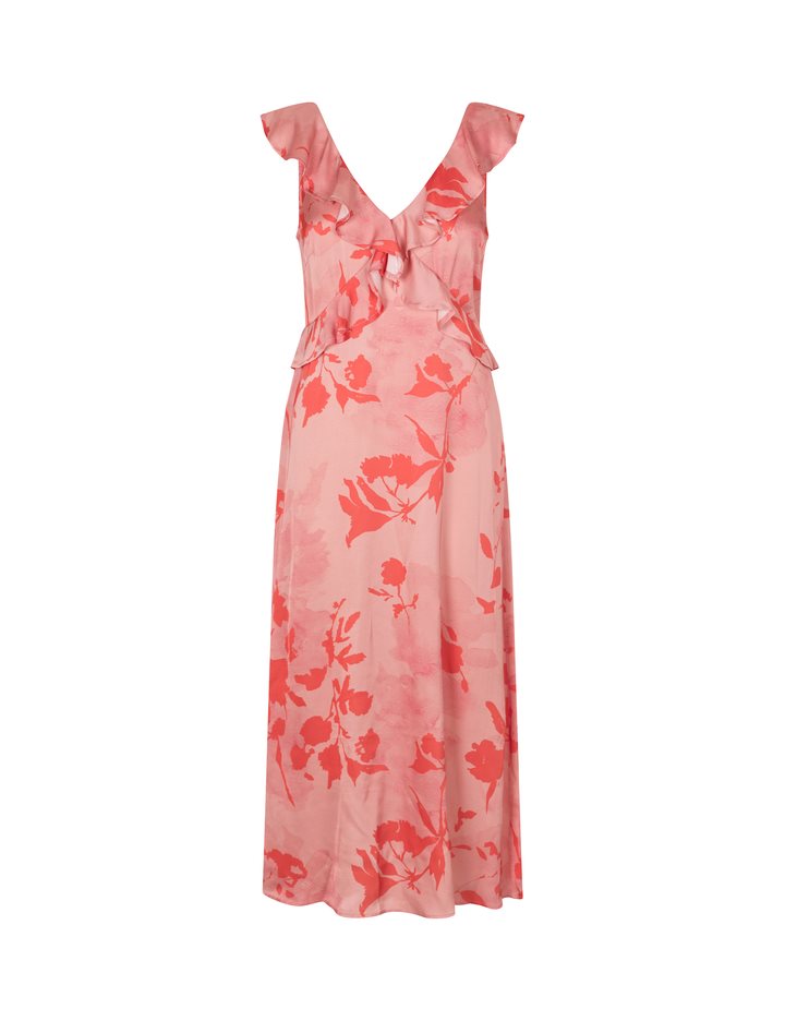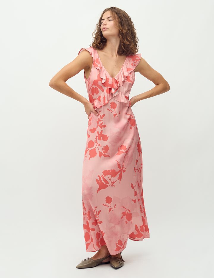 Feminine maxi dress with ruffles and print.- Material: 58& Ecovero Viscose, 42% Viscose- Maxi length- V-neck- Closes with zipper on the side- Ruffle details- Loose fitThe model's height is 176 cm and she is wearing size S.