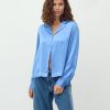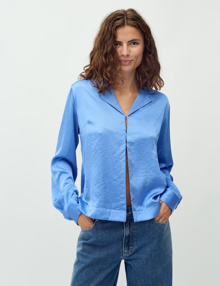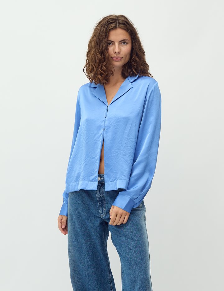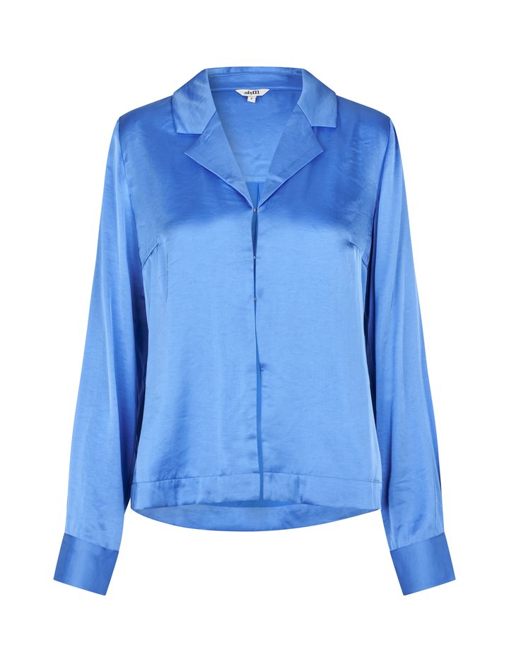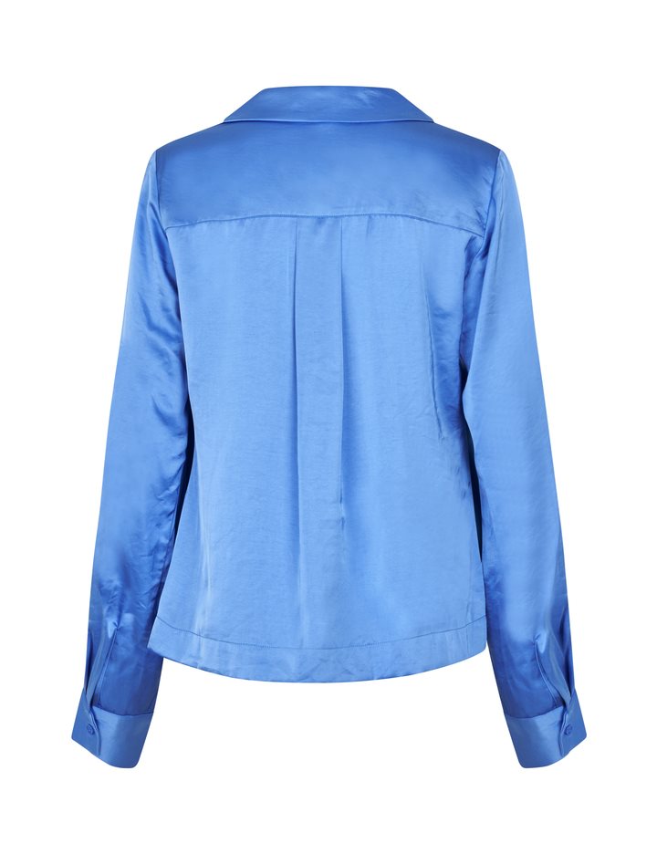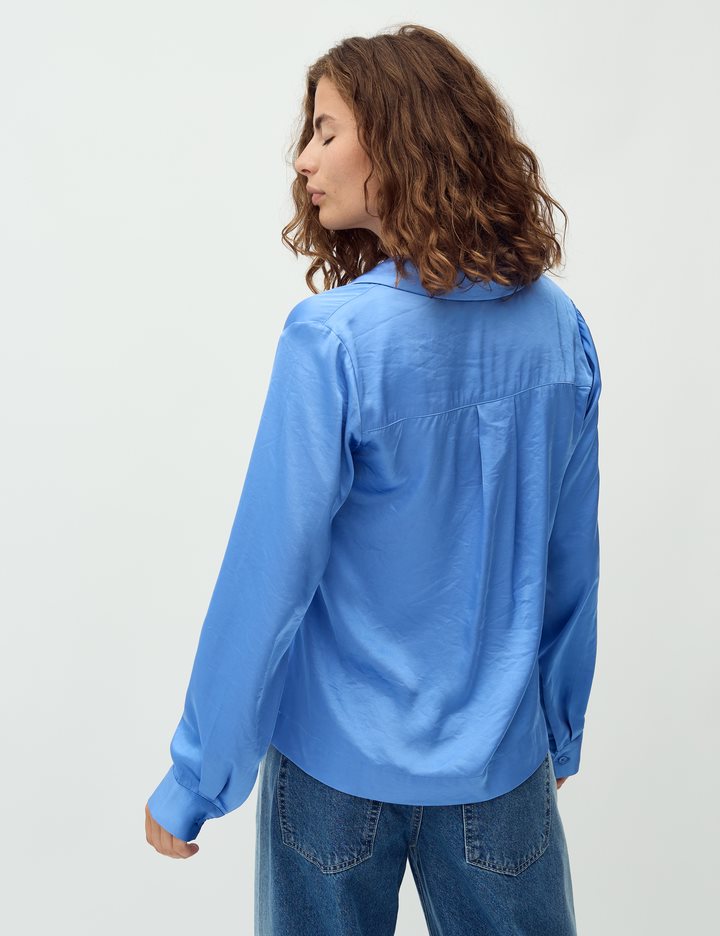 Satin shirt.- Material: 54% Polyester, 46% Viscose- Long sleeves- Shirt with collar- Satin quality- Relaxed fitThe model is 176 cm tall and is wearing a size S.