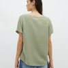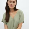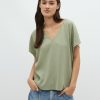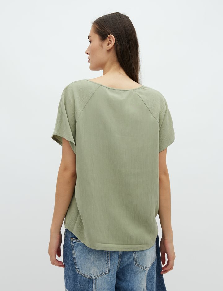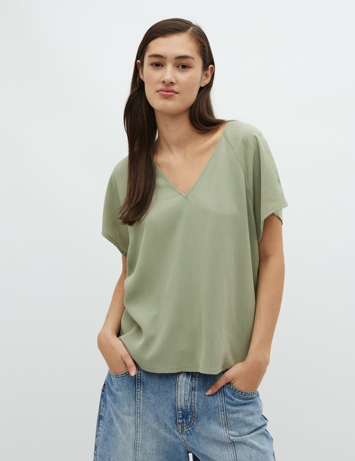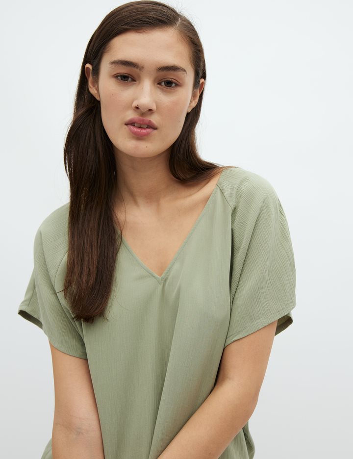Soft t-shirt with v-neck.- Material: 73% Modal, 27% Polyester- Loose fit – Short raglan sleeves- V neck- Color: Sea SprayThe height of the model is 178 cm and she is wearing a size S.