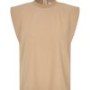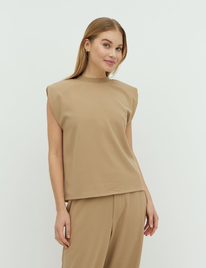 Top with shoulder pads.- Material: 60% Polyester, 35% Viscose, 5% Elastane- Without sleeves- Shoulder pads- Normal length- High neck- Relaxed fit- Hidden zip in the backThe height of the model is 175 cm and she is wearing a size S. She is wearing the matching Emmett-M trousers.