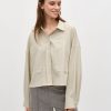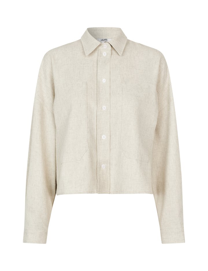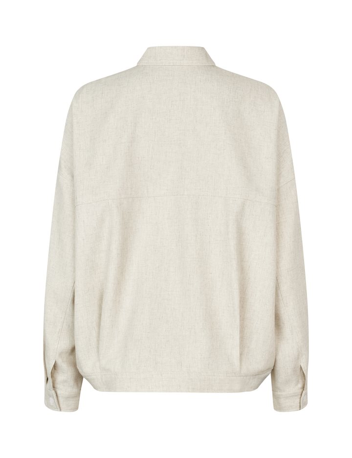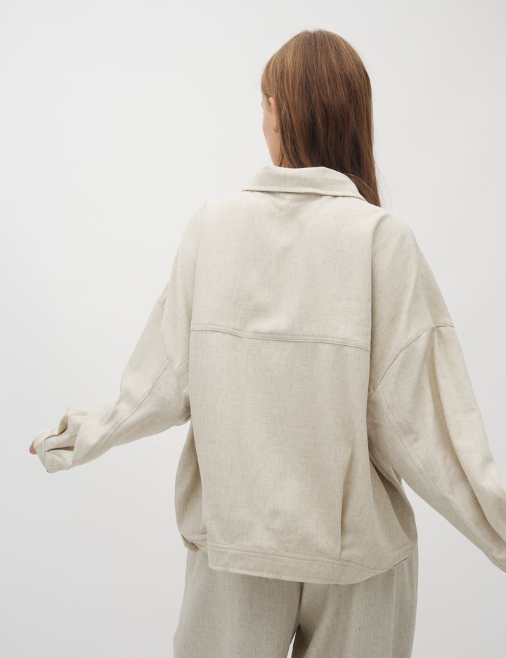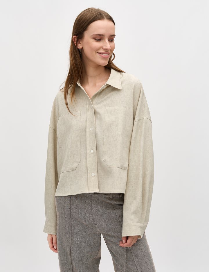Shirt with side details.- Material: 89% Polyester, 7% Linen, 4% Elastane- Long sleeves with pleated details- Loose fit- Shirt collar- Large front pockets- Closes with buttons- Asymmetric lengths front/backThe height of the model is 176 cm and she is wearing a size s.