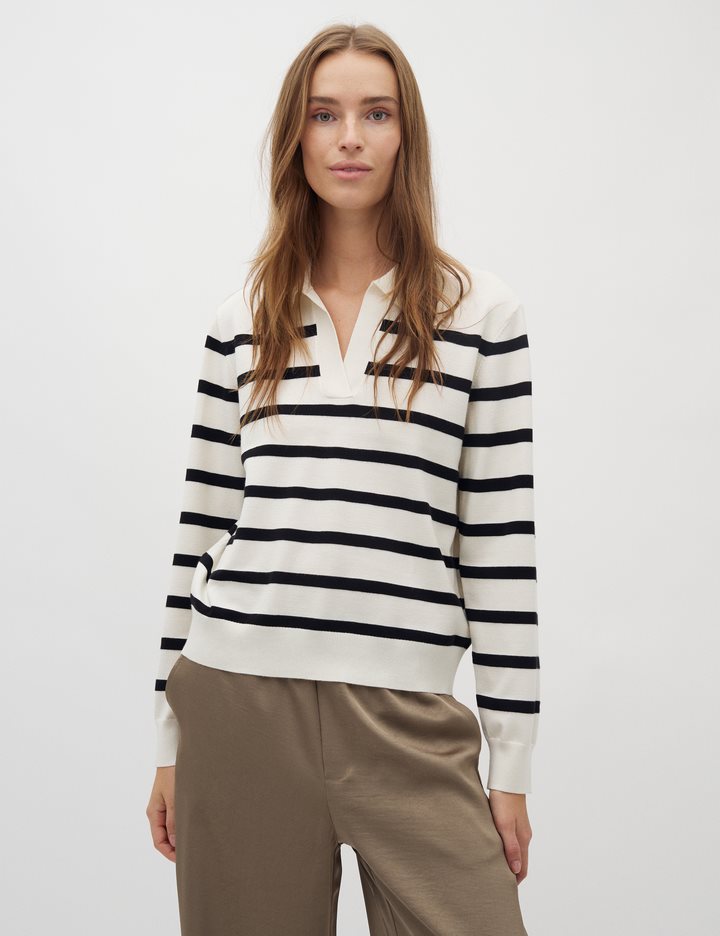Polo in a soft knit quality – Material: 70% Viscose, 30% Polyester- Loose fit- Polo collar- Striped- Soft knit quality- Color: Sugar Black Stripe
